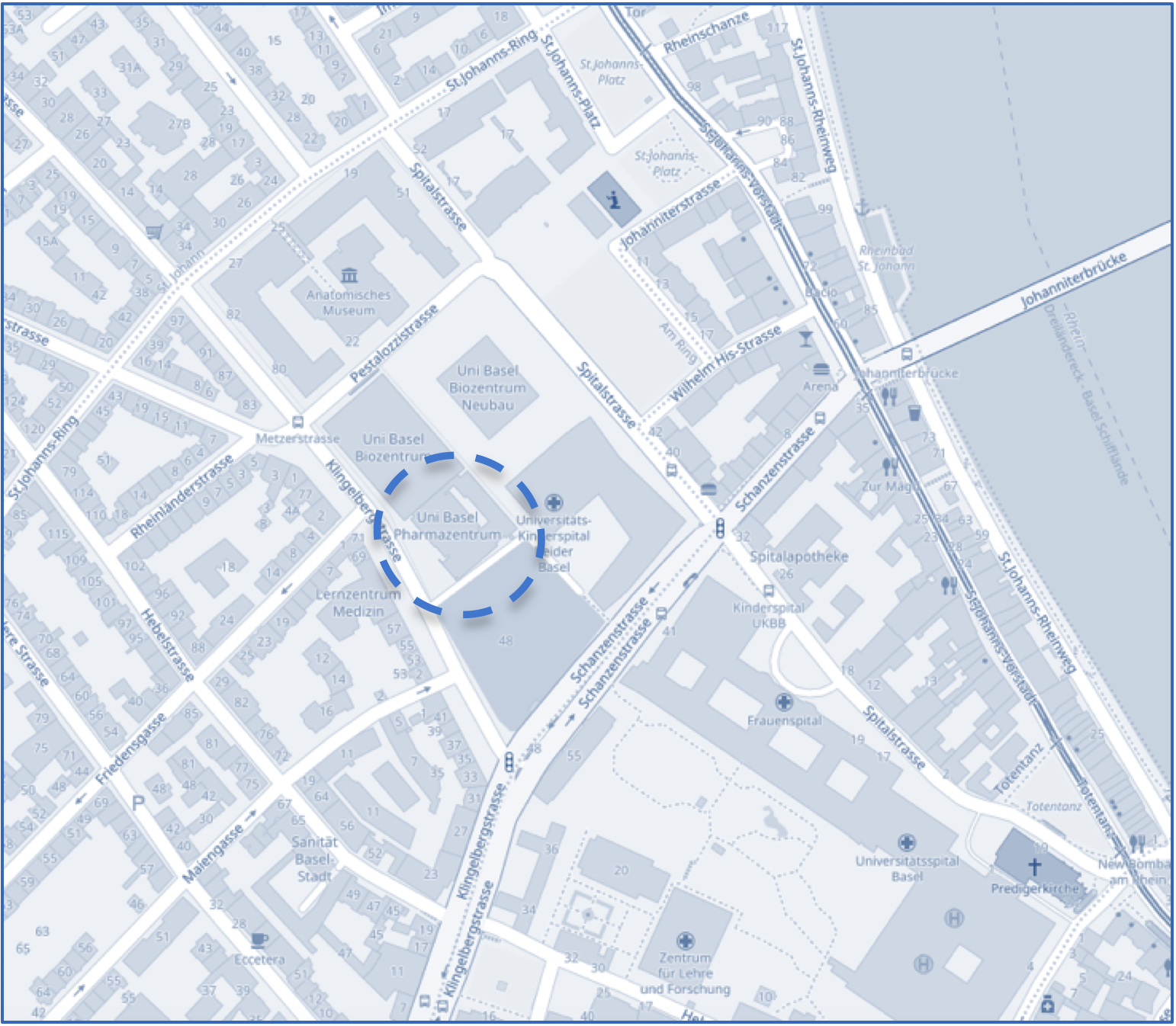 At the Basel SBB station take bus No. 30 to the stop Kinderspital. Cross the Street. Walk up Klingelberstrasse. Alternatively, take the Tram line No. 11 direction St. Louis Grenze to the station Johanniterbrücke.